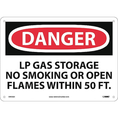 NMC D452AB OSHA Sign, Legend "DANGER - LP GAS STORAGE NO SMOKING OR OPEN FLAMES WITHIN 50 FT", 14" Length x 10" Height, Aluminum, Black/Red on White