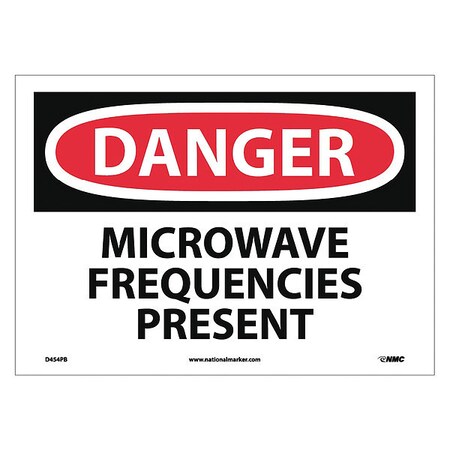 NMC D454PB OSHA Sign, Legend "DANGER - MICROWAVE FREQUENCIES PRESENT", 14" Length x 10" Height, Pressure Sensitive Vinyl, Black/Red on White