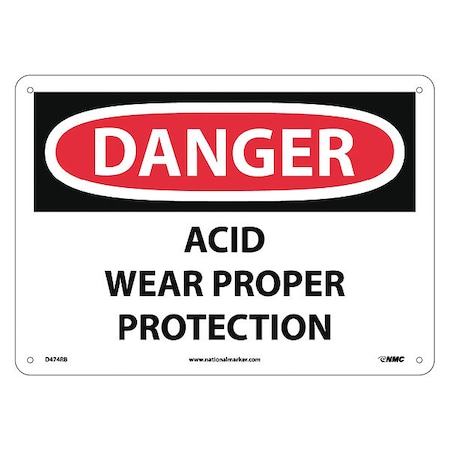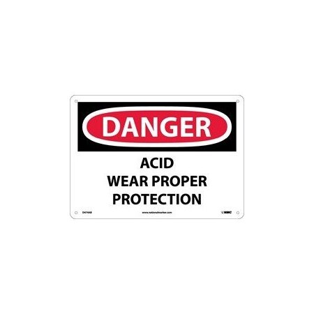 NMC D474RB OSHA Sign, Legend "DANGER - ACID WEAR PROPER PROTECTION", 14" Length x 10" Height, Rigid Plastic, Black/Red on White