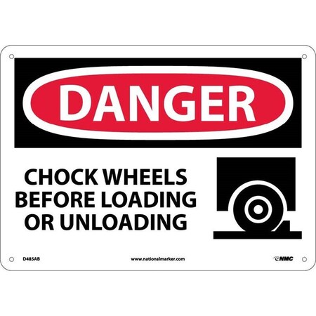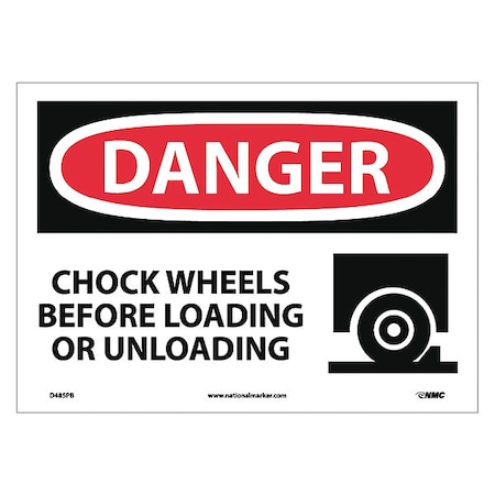NMC D485PB OSHA Sign, Legend "DANGER - CHOCK WHEELS BEFORE LOADING OR UNLOADING", 14" Length x 10" Height, Pressure Sensitive Vinyl, Red/Black on White