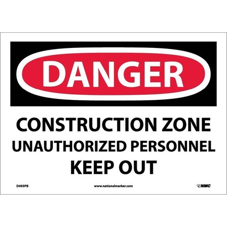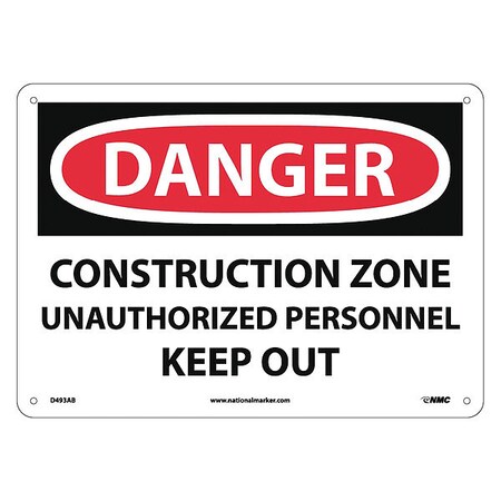 NMC D493AB OSHA Sign, Legend "DANGER - CONSTRUCTION ZONE UNAUTHORIZED PERSONNEL KEEP OUT", 14" Length x 10" Height, Aluminum, Black on White