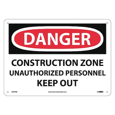 NMC D493RB OSHA Sign, Legend "DANGER - CONSTRUCTION ZONE UNAUTHORIZED PERSONNEL KEEP OUT", 14" Length x 10" Height, Rigid Plastic, Black on White