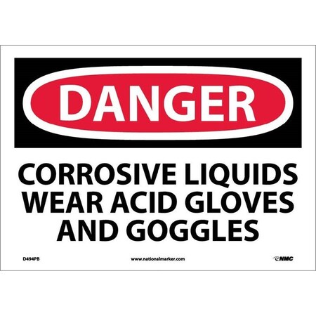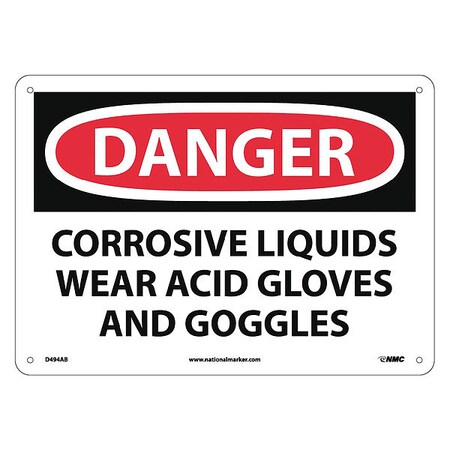 NMC D494AB OSHA Sign, Legend "DANGER - CORROSIVE LIQUIDS WEAR ACID GLOVES AND GOGGLES", 14" Length x 10" Height, Aluminum, Black on White