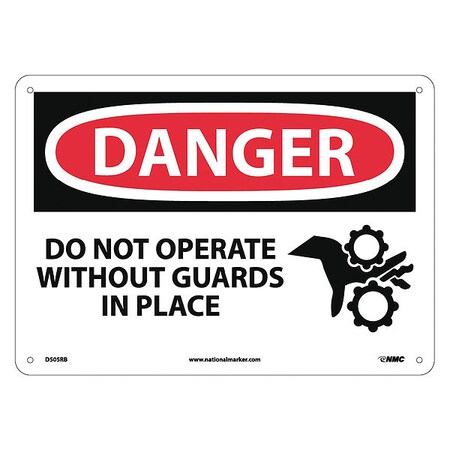 NMC D505RB OSHA Sign, Legend "DANGER - DO NOT OPERATE WITHOUT GUARDS IN PLACE" with Graphic, 14" Length x 10" Height, Rigid Plastic, Black on White