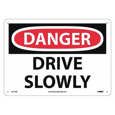NMC D511AB OSHA Sign, Legend "DANGER - DRIVE SLOWLY", 14" Length x 10" Height, Aluminum, Black on White