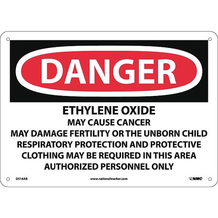 NMC D516AB OSHA Sign, Legend "DANGER - ETHYLENE OXIDE CANCER HAZARD AND REPRODUCTIVE HAZARD AUTHORIZED PERSONNEL ONLY...", 14" Length x 10" Height, Aluminum, Black on White