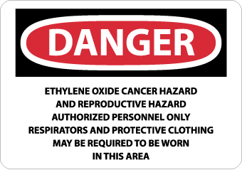 - Header "DANGER" and legend "ETHYLENE OXIDE CANCER HAZARD AND REPRODUCTIVE HAZARD AUTHORIZED PERSONNEL ONLY RESPIRATORS AND PROTECTIVE CLOTHING MAY BE REQUIRED TO BE WORN IN THIS AREA"