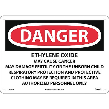 NMC D516RB OSHA Sign, Legend "DANGER - ETHYLENE OXIDE CANCER HAZARD AND REPRODUCTIVE HAZARD AUTHORIZED PERSONNEL ONLY...", 14" Length x 10" Height, Rigid Plastic, Black on White