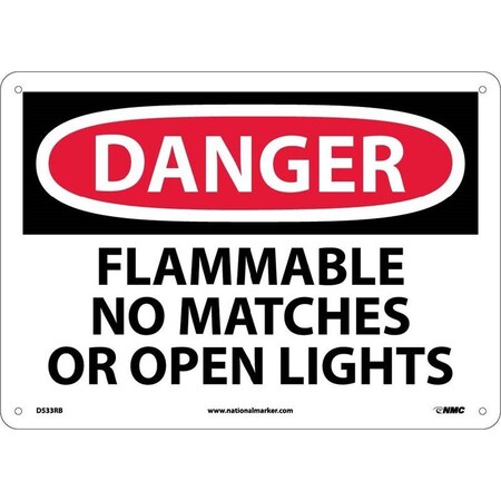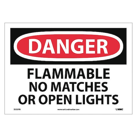 NMC D533PB OSHA Sign, Legend "DANGER - FLAMMABLE NO MATCHES OR OPEN LIGHTS", 14" Length x 10" Height, Pressure Sensitive Vinyl, Black/Red on White