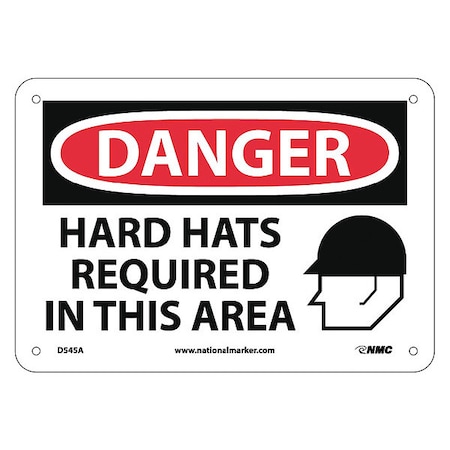 NMC D545A OSHA Sign, Legend "DANGER - HARD HATS REQUIRED IN THIS AREA" with Graphic, 10" Length x 7" Height, Aluminum, Black/Red on White
