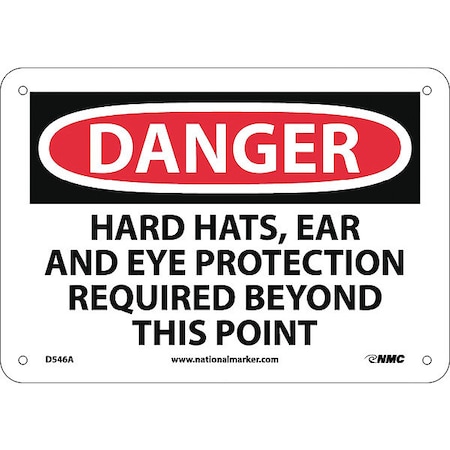 NMC D546A OSHA Sign, Legend "DANGER - HARD HATS EAR AND EYE PROTECTION REQUIRED BEYOND THIS POINT", 10" Length x 7" Height, Aluminum, Black/Red on White