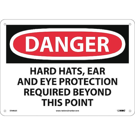 NMC D546AB OSHA Sign, Legend "DANGER - HARD HATS, EAR AND EYE PROTECTION REQUIRED BEYOND THIS POINT", 14" Length x 10" Height, Aluminum, Black/Red on White