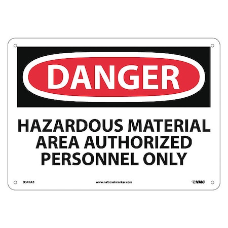 NMC D547AB OSHA Sign, Legend "DANGER - HAZARDOUS MATERIAL AREA AUTHORIZED PERSONNEL ONLY", 14" Length x 10" Height, 0.040 Aluminum, Black/Red on White