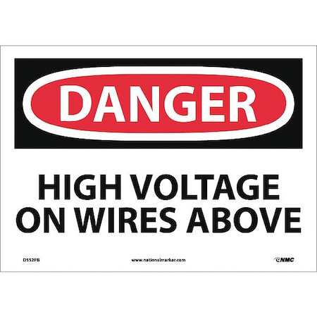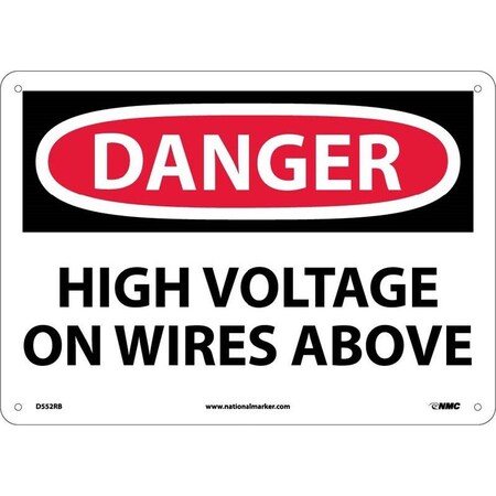 NMC D552PB OSHA Sign, Legend "DANGER - HIGH VOLTAGE ON WIRES ABOVE", 14" Length x 10" Height, Pressure Sensitive Adhesive Vinyl, Black/Red on White