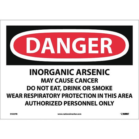 NMC D562PB OSHA Sign, Legend "DANGER - INORGANIC ARSENIC CANCER HAZARD AUTHORIZED PERSONNEL ONLY NO SMOKING OR EATING RESPIRATOR REQUIRED", 14" Length x 10" Height, Pressure Sensitive Adhesive Vinyl, Black/Red on White