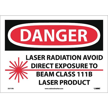 NMC D571PB OSHA Sign, Legend "DANGER - LASER RADIATION AVOID DIRECT EXPOSURE TO BEAM CLASS 111B LASER PRODUCT" with Graphic, 14" Length x 10" Height, Pressure Sensitive Adhesive Vinyl, Black/Red on White