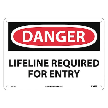 NMC D575AB OSHA Sign, Legend "DANGER - LIFELINE REQUIRED FOR ENTRY", 14" Length x 10" Height, Aluminum, Black/Red on White