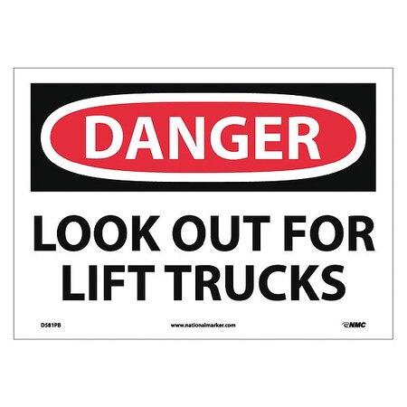 NMC D581PB OSHA Sign, Legend "DANGER - LOOK OUT FOR LIFT TRUCKS", 14" Length x 10" Height, Pressure Sensitive Vinyl, Black/Red on White