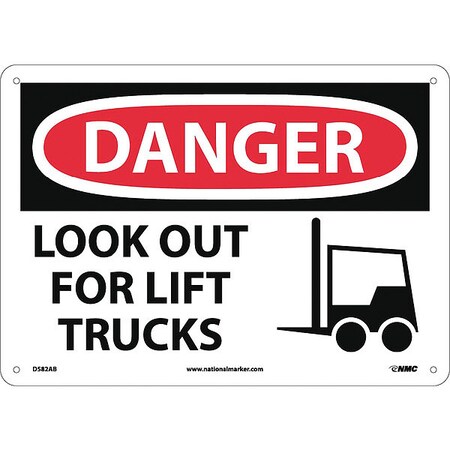 NMC D582AB OSHA Sign, Legend "DANGER - LOOK OUT FOR LIFT TRUCKS" with Graphic, 14" Length x 10" Height, Aluminum, Black/Red on White