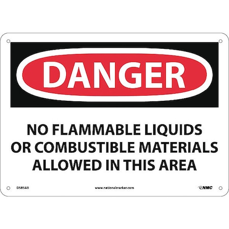 NMC D585AB OSHA Sign, Legend "DANGER - NO FLAMMABLE LIQUIDS OR COMBUSTIBLE MATERIALS ALLOWED IN THIS AREA", 14" Length x 10" Height, Aluminum, Black/Red on White