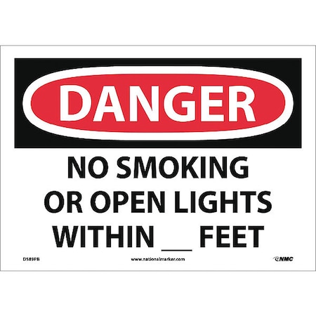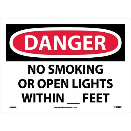NMC D589PB OSHA Sign, Legend "DANGER - NO SMOKING OR OPEN LIGHTS WITHIN _ FEET", 14" Length x 10" Height, Pressure Sensitive Vinyl, Black/Red on White