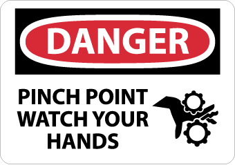 | Feature | Header "DANGER" and legend "PINCH POINT WATCH YOUR HANDS" with graphic |