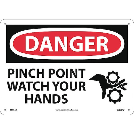 NMC D600AB OSHA Sign, Legend "DANGER - PINCH POINT WATCH YOUR HANDS" with Graphic, 14" Length x 10" Height, Aluminum, Black/Red on White