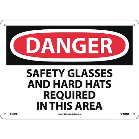 NMC D610RB DANGER - SAFETY GLASSES AND HARD HATS REQUIRED IN THIS AREA - 14 in. x 10 in. Rigid Plastic Danger Sign with White/Black Text on Red/White Base