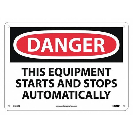 NMC D618RB OSHA Sign, Legend "DANGER - THIS EQUIPMENT STARTS AND STOPS AUTOMATICALLY", 14" Length x 10" Height, Rigid Plastic, Black/Red on White