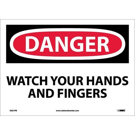 NMC D621AB OSHA Sign, Legend "DANGER - WATCH YOUR HANDS AND FINGERS" 14" Length x 10" Height, Aluminum, Black/Red on White