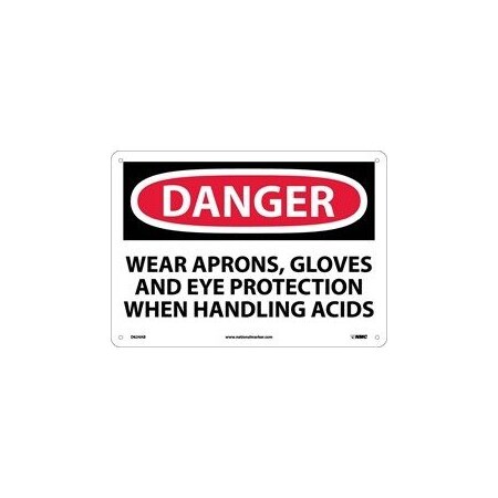 NMC D624AB OSHA Sign, Legend "DANGER - WEAR APRONS GLOVES AND EYE PROTECTION WHEN HANDLING ACIDS" 14" Length x 10" Height, Aluminum, Black/Red on White