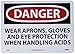 | Feature | Header "DANGER" and legend "WEAR APRONS GLOVES AND EYE PROTECTION WHEN HANDLING ACIDS" |