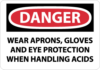 - Danger Signage: this sign instructs workers or employees to wear aprons, gloves and eye protection when handling acids. It is mostly used in laboratories, industrial facilities and chemical plants where acid is used