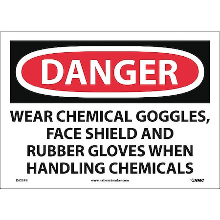 NMC D625PB OSHA Sign, Legend "DANGER - WEAR CHEMICAL GOGGLES, FACE SHIELD AND...", 14" Length x 10" Height, Pressure Sensitive Vinyl, Black/Red on White