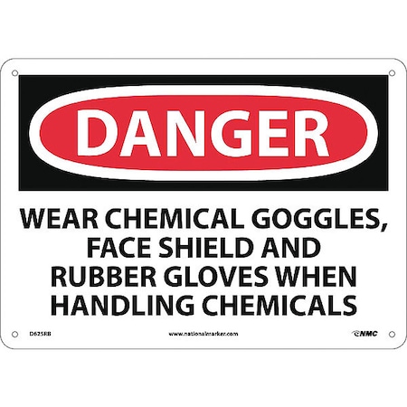 NMC D625RB OSHA Sign, Legend "DANGER - WEAR CHEMICAL GOGGLES, FACE SHIELD AND...", 14" Length x 10" Height, Rigid Plastic, Black/Red on White