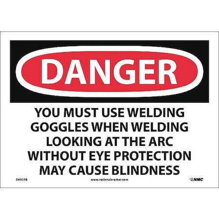NMC D631PB OSHA Sign, Legend "DANGER - YOU MUST USE WELDING GOGGLES WHEN WELDING LOOKING AT THE ARC WITHOUT EYE PROTECTION MAY CAUSE...", 14" Length x 10" Height, Pressure Sensitive Vinyl, Black/Red on White