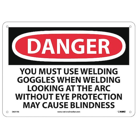 NMC D631RB OSHA Sign, Legend "DANGER - YOU MUST USE WELDING GOGGLES WHEN WELDING LOOKING AT THE ARC WITHOUT EYE PROTECTION MAY CAUSE BLINDNESS", 14" Length x 10" Height, Rigid Plastic, Black/Red on White