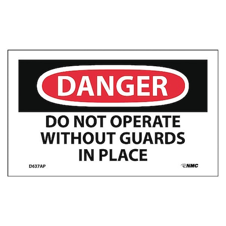 NMC D637AP OSHA Sign, Legend "DANGER - DO NOT OPERATE WITHOUT GUARDS IN PLACE", 5" Length x 3" Height, Pressure Sensitive Vinyl, Black on White (Pack of 5)