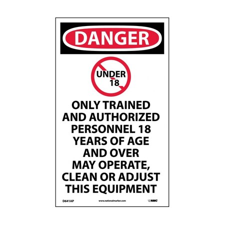 NMC D641AP OSHA Sign, Legend "DANGER - ONLY TRAINED AND AUTHORIZED PERSONNEL..." with UNDER 18 Slash Graphic, 3" Length x 5" Height, Pressure Sensitive Vinyl, Black/Red on White (Pack of 5)
