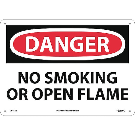 NMC D648AB OSHA Sign, Legend "DANGER - NO SMOKING OR OPEN FLAME", 14" Length x 10" Height, Aluminum, Black/Red on White