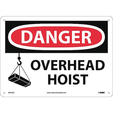 NMC D653AB OSHA Sign, Legend "DANGER - OVERHEAD HOIST" with Graphic, 14" Length x 10" Height, Aluminum, Black/Red on White