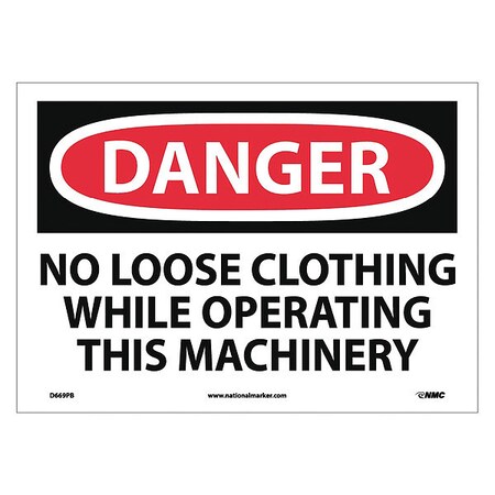 NMC D669PB OSHA Sign, Legend "DANGER - NO LOOSE CLOTHING WHILE OPERATING THIS MACHINERY", 14" Length x 10" Height, Pressure Sensitive Vinyl, Black/Red on White