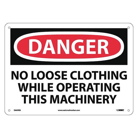NMC D669RB OSHA Sign, Legend "DANGER - NO LOOSE CLOTHING WHILE OPERATING THIS MACHINERY", 14" Length x 10" Height, Rigid Plastic, Black/Red on White