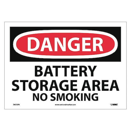 NMC D672PB DANGER - BATTERY STORAGE AREA NO SMOKING Sign - 14 in. x 10 in., Red/Black Text on White, PS Vinyl Danger Sign