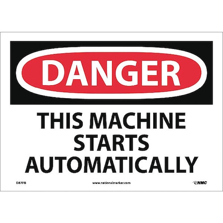 NMC D87PB OSHA Sign, Legend "DANGER - THIS MACHINE STARTS AUTOMATICALLY" with Graphic, 14" Length x 10" Height, Pressure Sensitive Vinyl, Black/Red on White