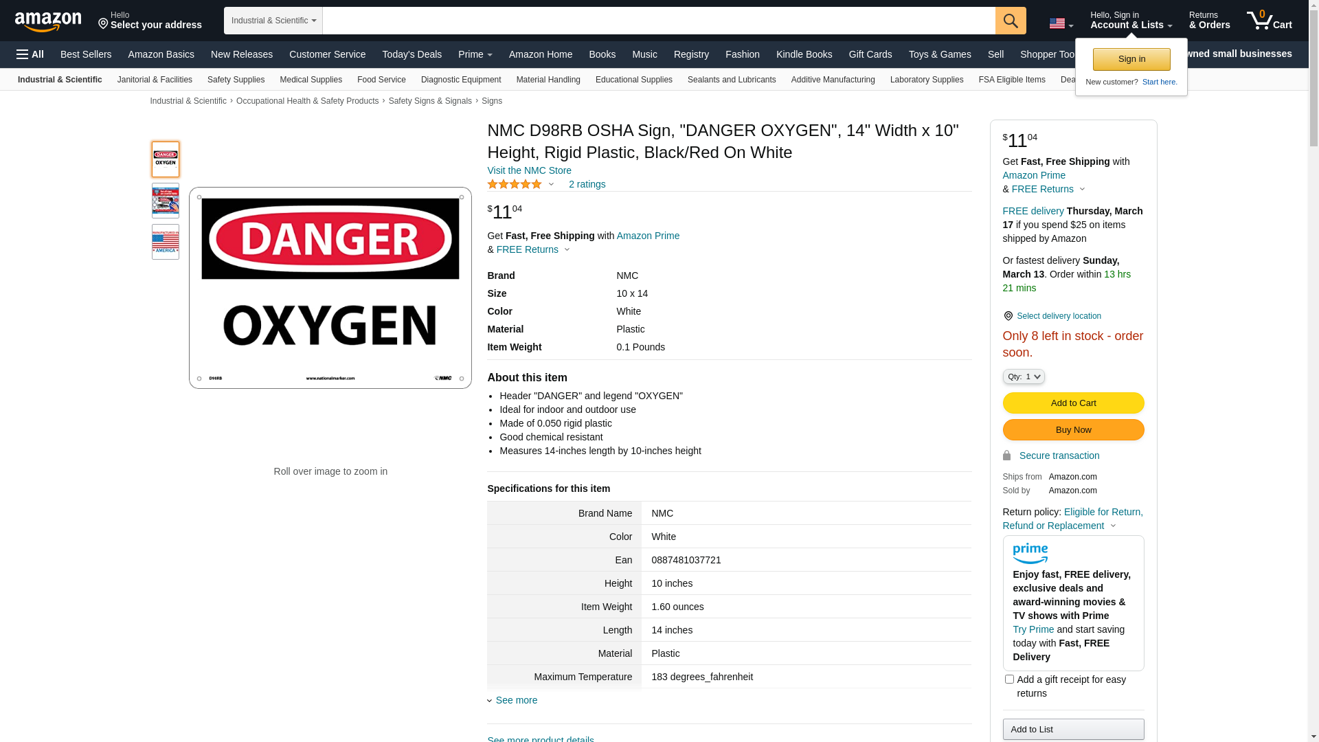 NMC D98RB OSHA Sign, "DANGER OXYGEN", 14" Width x 10" Height, Rigid Plastic, Black/Red On White