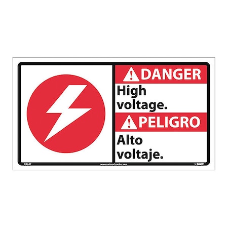 NMC DBA3P Bilingual OSHA Sign, Legend "DANGER - High voltage." with Electrical2 Graphic, 18" Length x 10" Height, Pressure Sensitive Adhesive Vinyl, Black/Red on White