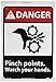 | Feature | Header "DANGER" and legend "Pinch points. Watch your hands." with graphic |