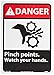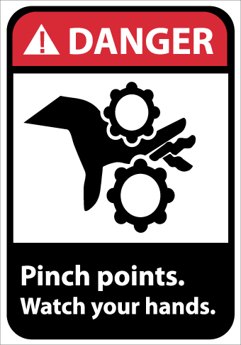 | Feature | Header "DANGER" and legend "Pinch points. Watch your hands." with graphic |