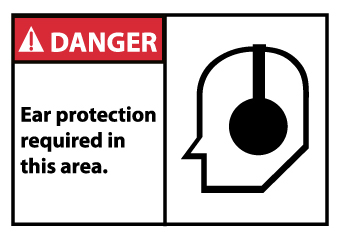 - Header "DANGER" and legend "Ear protection required in this area." with graphic